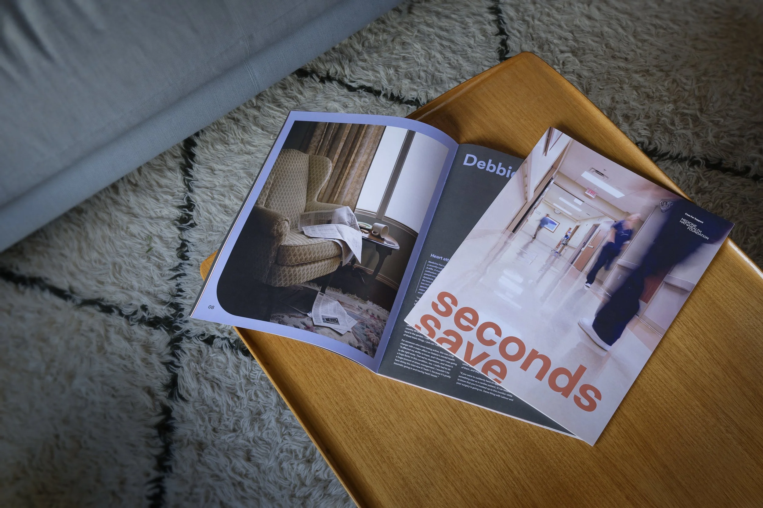 Every heartbeat counts, and within the Medicine Hat area, the Medicine Hat Hospital and Health Foundation serve as its vital pulse. Recognizing their urgent need for new cardiac equipment to maintain the highest standard of care, we launched a campaign to rally community support. Here, I had the opportunity to conceptualize, shoot, and design the campaign's call-to-action book, microsite, commercial, and digital/print campaign collateral. Rooted in the understanding that the impact of a cardiac crisis extends beyond the hospital bedside, affecting the lives of patients' families and friends, this campaign aims to spark action. In emergencies, every second counts, leaving behind fragments of life. The photography captures these remnants. The large book showcases patient testimonials, while the small one at the centre highlights the foundation's community support efforts.